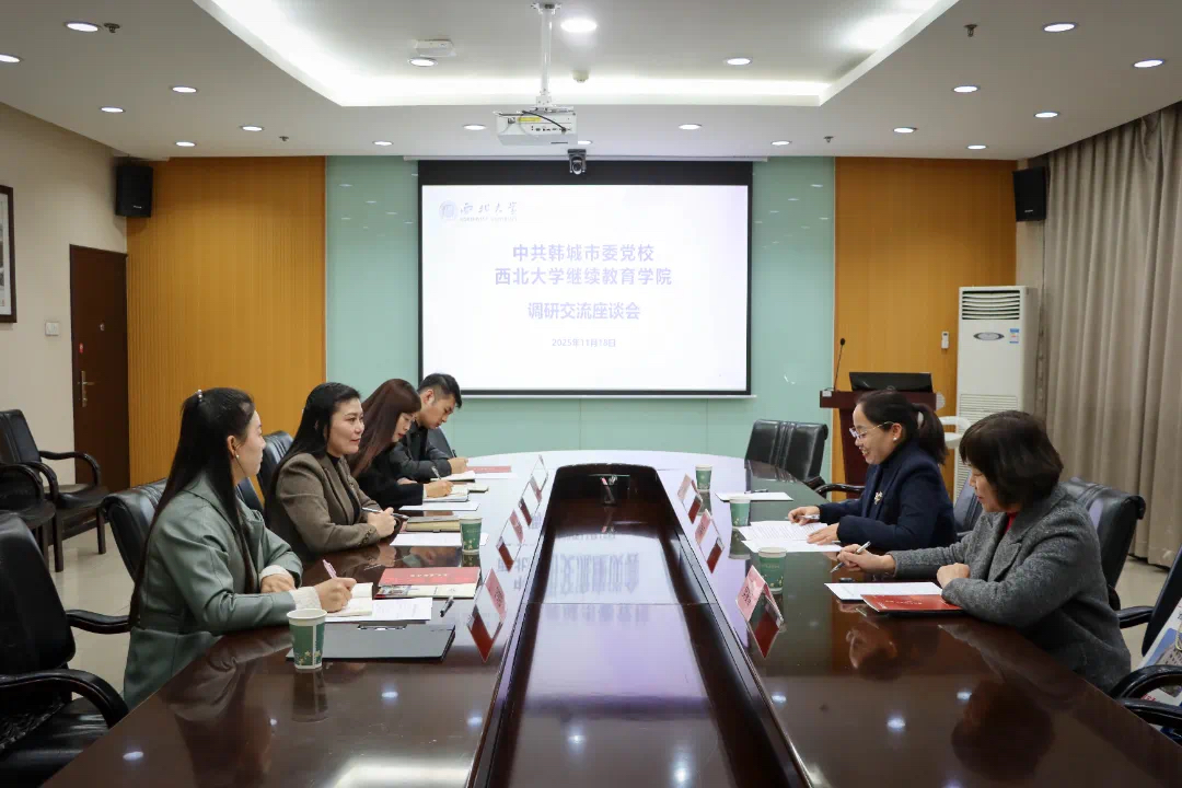 11月18日,中共韩城市委党校副校长程艳丽一行来我院调研干部教育培训工作。陕西省干部教育培训西北大学基地办公室副主任、西北大学继续教育学院院长、中华文化培训学院常务副院长孙二丽主持座谈会。