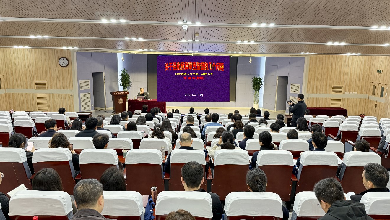 张建申结合自身多年的履职实践与研究心得,以“管住管好人民的钱袋子,让财政资金用在刀刃上”为核心,围绕预算审查监督几个重要问题、为什么要强化预算审查监督、如何更好强化预算审查监督三方面展开讲授,系统阐述了关于强化预算审查监督的实践路径。他指出,做好预算审查监督工作,要坚持依法监督,深刻把握预算法的精神实质与规范要求,确保预算编制、执行、调整及决算各环节均在法治轨道上运行;要突出监督重点,聚焦财政收支政策落实、重大项目实施、专项资金使用绩效以及政府债务风险管控等核心内容;要强化全过程监督,通过信息化手段,推动监督关口前移、链条延伸,实现从程序性审查向实质性监督的深化。他强调,预算审查监督与国家治理、人民利益的内在关联为依法履行人大监督职权提供了理论支撑与实践指引,要发挥代表主体作用、提升专业审查能力、推动审计成果运用、增强监督透明度的重要性,切实推动财政资源发挥最大效益,为服务陕西经济社会高质量发展贡献人大智慧和力量。